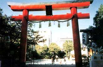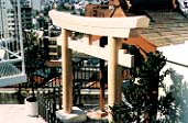 笠木に独特の形をほどこした鳥居。 企業の屋上に建立。 |